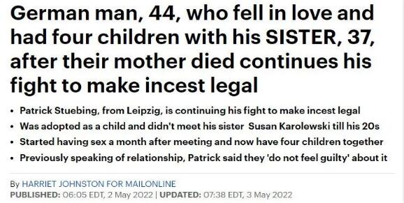 “德国骨科兄妹”原型的近况我们不得而知,但是在德国确实有这样一对兄妹乱伦生下四子,还恳求政府让他们结婚: ![]() 来自德国莱比锡市的44岁男子Patrick Stuebing有着一段悲惨童年,他出生于一个贫穷且文化程度极低的家庭,是家里八个孩子中的老三。 ![]() Patrick有一个暴虐的父亲,Patrick三岁时父亲用刀袭击了他,在社会福利机构介入下,Patrick被送往了寄养家庭照顾。 1996年,18岁的Patrick决定寻找他的亲生父母。 四年后,他如愿与自己的母亲相认,可惜当时其他六个兄弟姐妹都已经相继去世,唯独剩下15岁的亲妹妹Susan Karolewski。 ![]() 因为Patrick被从这个家庭中带走的时候,Susan还没有出生…所以兄妹两人的第一次见面,就是在这种情况之下。 不久后,Patrick就搬来与母亲还有妹妹同住。 为了促进这对初见兄妹俩之间的感情,他们的母亲干脆让他们住进了同一个房间,结果却没想到造成了极其可怕的后果... Susan爱上了这个哥哥,而Patrick对妹妹也很有好感。 六个月后,母亲因为心脏病发作而死亡,Patrick和妹妹Susan相依为命。 ![]() 然而这段本该是互相照应的亲情,却在接下来的相处中逐渐变了质! 2001年1月,Patrick和自己的妹妹发生了亲密关系。据法庭披露,他们在2001年1月至8月期间共发生了16次关系,并且很少使用保护措施。 最终Susan怀孕了,2001年10月,年仅16岁的苏珊生下了一个天生严重残疾男婴。 2002年,两人因乱伦罪受审。Patrick在被莱比锡地区法院判处所有罪名成立后,被判缓刑一年。 当时仅17岁的Susan因为是未成年,并被安置在青少年服务机构。 ![]() 可是,他们两个依然并不认为这件事情是错误的,并且还在将这份错误持续下去。 2003年,Susan生下了他们的二女儿Sarah,同样身患残疾。 2004年,他们迎来了第三个女儿,Nancy。 2005年,他们又迎来了第四个女儿,Sophia。 因此Patrick又连续两次因为犯下乱伦罪而被捕入狱,分别判处了十个月以及两年半的有期徒刑... Patrick被送进监狱后,Susan还在媒体面前痛哭,表示没有哥哥会活不下去,Patrick也以自杀相抵抗。 然而不久,Susan却又与另一个男人怀上了第五个孩子。 ![]() 在Patrick出狱后,兄妹俩又继续厮混在一起。妹妹Susan还对媒体表示,她和哥哥是自然而然的“真爱”: “我和Patrick小时候并不认识,所以我们在成年后坠入爱河是和亲情有区别的,那是真实的爱,我们对此也无能为力。 因为我们互相吸引,然后跟随直觉和内心,这根本就没有错!” |