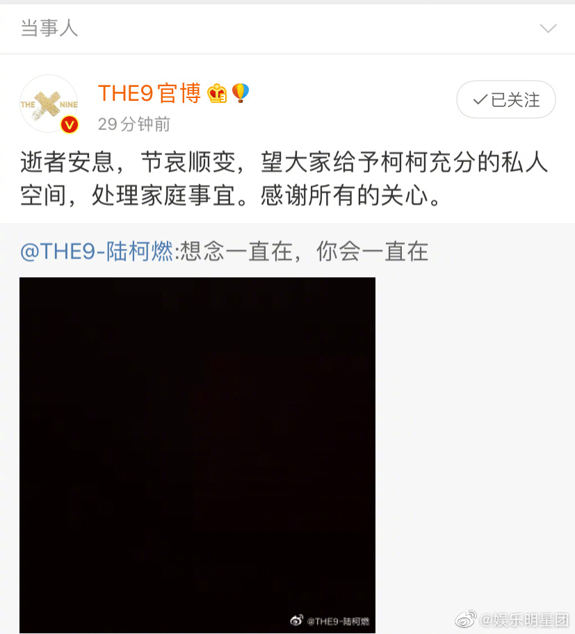 陆柯燃家里出事的消息是在2020年8月31日传出来的,当时THE9官博发表公告称:“我司旗下组合THE9成员陆柯燃因个人事务,将暂时缺席各类团体活动及录制行程。”而陆柯燃的后援会发文称“据和公司沟通了解,柯柯因家里原因,需要回家照看一段时间,工作事务且暂时告假一段,在此期间,希望粉丝们可以尊重柯柯隐私,千万不要打扰到她及家人,不多关注她这段时间的私人行程,安心等她回归。”