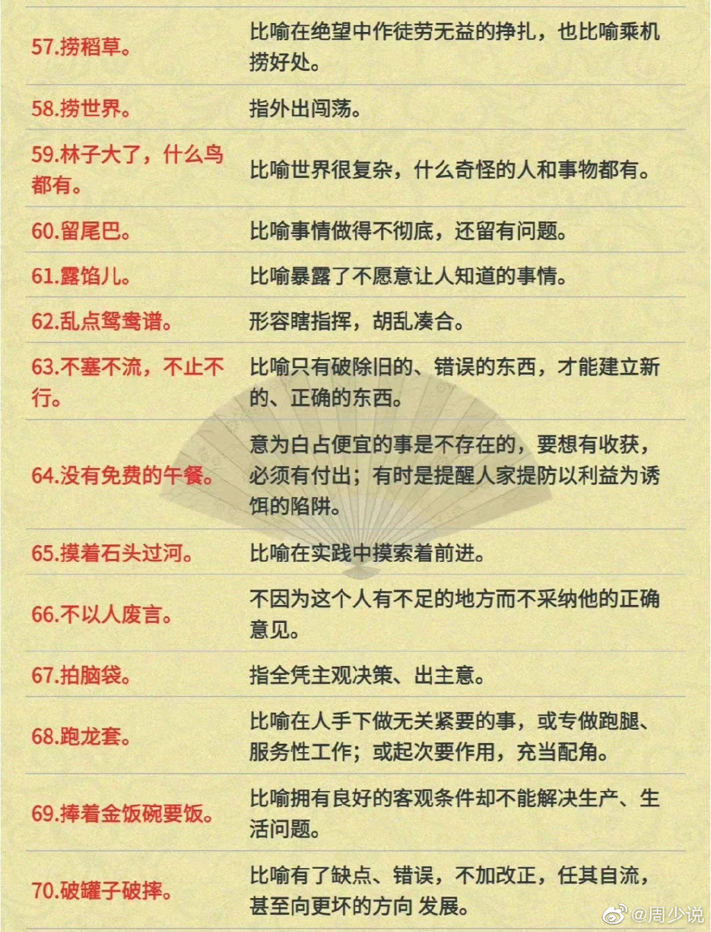 今天咱们说的“俗语”,不是值得低俗,而是通俗的道理和典故,是老百姓常用的一些话。这些俗语蕴含很多道理,老百姓经常引用,俗语是把晦涩的道理平民化,浅显化,比如大军事家刘伯温有文曰:“金玉其外,败絮其中。”老百姓有俗语,管这叫:“银样蜡枪头”;清代进士徐宗干有联云:“一味黑时犹有骨,十分红处便成灰!”平民布衣也有俗话,智慧精炼在三言两语之间 ....等等。今天给大家送上常用俗语100条,看看那些是你最常用的?
