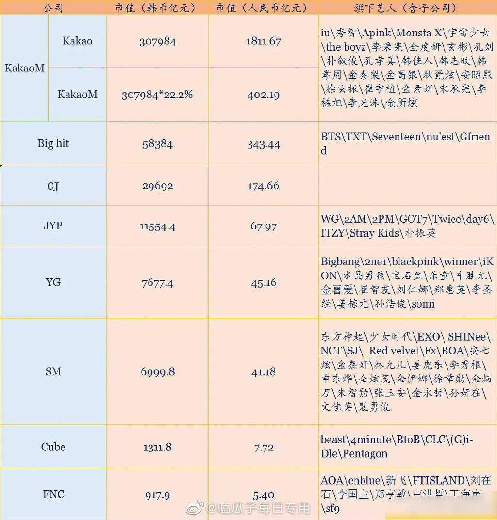 ![]() 星船的母公司是Kakao娱乐,Kakao娱乐(韩语:주식회사 카카오엔터테인먼트,以 kakao ENTERTAINMENT 呈现),是跨足娱乐、大众传媒和出版的韩国公司,成立于2021年。Kakao娱乐是Kakao的子公司,它是由原先Kakao旗下两家子公司KakaoPage及Kakao M合并所成立。根据2020年的一份数据来看,Kakao娱乐的市值遥遥领先其他娱乐公司,在韩国绝对算的上是大规模的娱乐公司了,当然,目前星船娱乐跟JYP、SM、YG的知名度在国内来看,还是差点事,很多人只是知道JYP和SM,但是不知道星船,实际星船实力不容小区! ![]() |