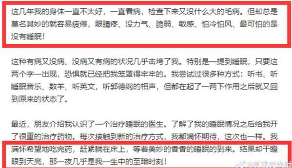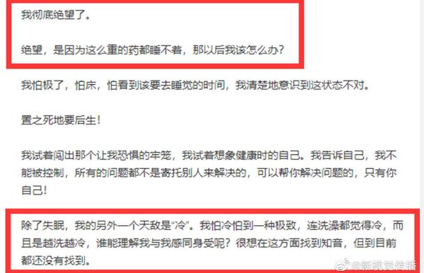 前段时间,久未露面的李冰冰突然发布了一篇长文,这篇长文中有颇多感慨。除了对死亡的恐惧之外,他还透露了自己的身体情况。她表示,近几年自己的身体很不好,常常不明所以的疲倦无力、脆弱怕冷,但是去医院检查后也查不出什么毛病。除此之外,最痛苦的是她还常常睡不着觉,哪怕想尽各种办法,但都没什么效果,看了医生也并不能改善什么。而这种看似有病,实际没病的情况也几乎要将李冰彻底击垮,而李冰冰现在的情况也让大家表示很心疼。