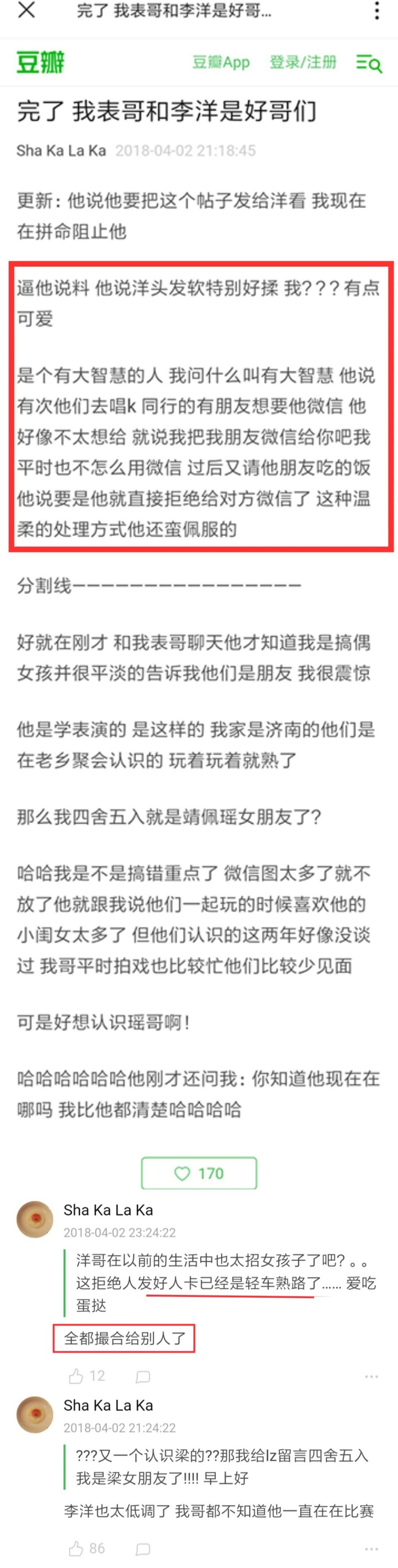 图⑥,豆瓣别家粉丝爆料。经常发女生好人卡,会撮合别人。