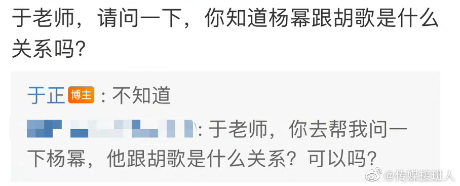 最近,有网友问于正,杨幂和胡歌是什么关系,对此于正回答:“不知道”,其实网友之所以有这么一个问题,是因为网传杨幂和胡歌曾经在一起过,也就是说彼此是互为前任的关系。当然,更多的网友认为两个人只是“前同事关系”(一起拍过戏)。