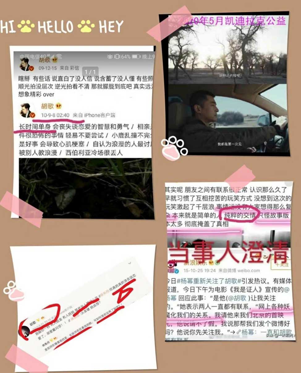 而且从胡歌的微博也能看出一些,他微博还是经常发自己的生活之类的,不像现在一样宣传委员一样,有一篇酒后微博写了“如果我明天领证你们会祝福我吗……妈妈你开心吗,我尽力了”等等,能看出来这段恋情估计家里人也不同意,后来还发了一篇微博配图是胡杨(胡歌、杨幂)树,经典的那句“相见恨晚,相爱恨早”……2011年1月8号这天杨幂和胡歌分别发了这句相见恨晚和相见恨早类似的话,后来杨幂和刘恺威宣布交往以及宣布结婚的日期都是当年的1月8号。