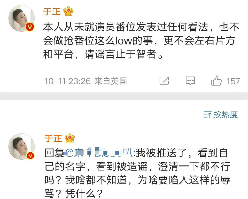 对于于正意思内涵信息,王鹤棣的粉丝表示:“别撕别内涵。真的。拍好剧最重要~真的不要 欺负我们家棣棣哦~不然。。。”;而于正则大方的表示:“没内涵,我就算有20个脑子也想不到你们想的那个特角旮旯,我有必要得罪新晋顶流吗?也不用脑子想想!” ![]() 此前,在2022年10月4日,于正发文表示:“同一个演员,不同的造型,便有不同的感觉,一个眼神飞起,故事就来了……温婉哀怨的末代皇后婉容VS推广珠宝的时尚女星,信手拈来,毫无违和感。评论区推荐男演员给我的一大堆,你们觉得谁跟她最般配?欢迎推荐新人和巨星,二三线免了。为啥呢?巨星可以扛剧,一人单挑,无所谓搭档是谁,像杨幂当年的古剑,赵丽颖当年的倾城时光…二三线演员自己位置不稳、需要跟别人抢番压番,没能力打剧所以,推荐谁,你们看着办!@何瑞贤” ![]() 此外,于正还表示:“本人从未就演员番位发表过任何看法,也不会做抢番位这么low的事,更不会左右片方和平台,请谣言止于智者。”所谓的“抢番”指的是演员在剧中的地位,一番也就是一号主角,其他的一次排序,在宣传物料中,一番演员也会被安排在C位。演员的番位就是演员在观众心目中实力的认可度。 ![]() |