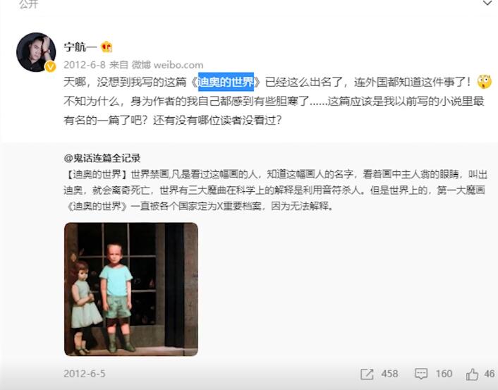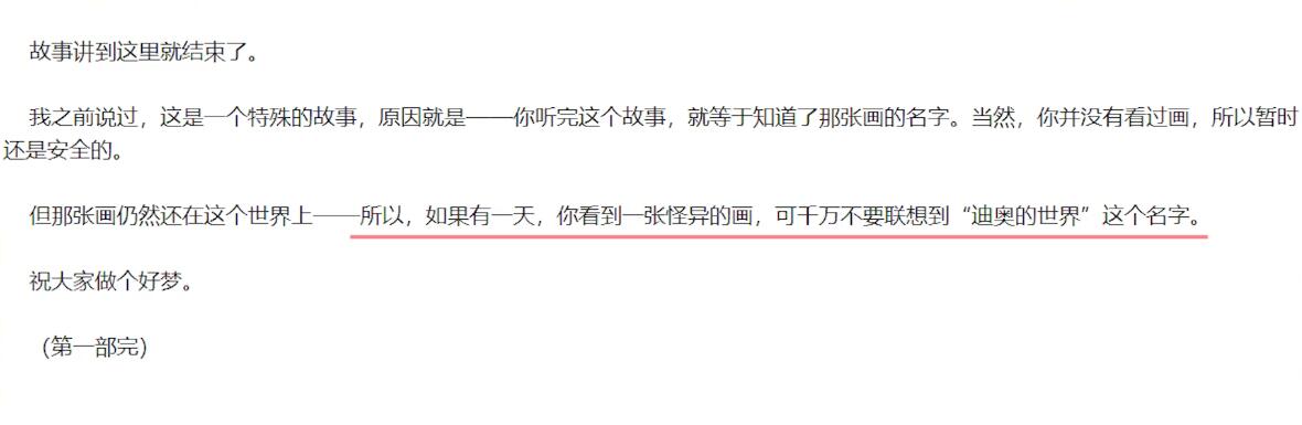 那么这幅画再传到国内之后,怎么名字又变成了“迪奥的世界”了呢?说起来,这又是另外一个故事了,2008年,国内知名悬疑小说家宁航一在他的《幽冥怪谈:夜话》的一书的结尾处有这样一句话“所以如果有一天你看到一张怪异的话,可千万不要联想到《迪奥的世界》这个名字哦。”