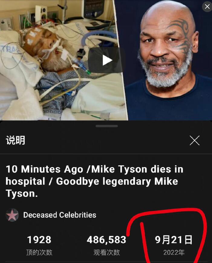 2022年10月24日晚上,一则消息在微博、朋友圈内发酵,消息内容是一张图片,图上是一个像极了泰森的满脸白胡子老人,插着各种维持生命的医疗设备躺在病床上,生命岌岌可危。网友称泰森已经去世了,1966年出生的泰森不过才56岁而已,这对一个身体强壮的拳击运动员来说,显然是太年轻了,那么真相如何呢?