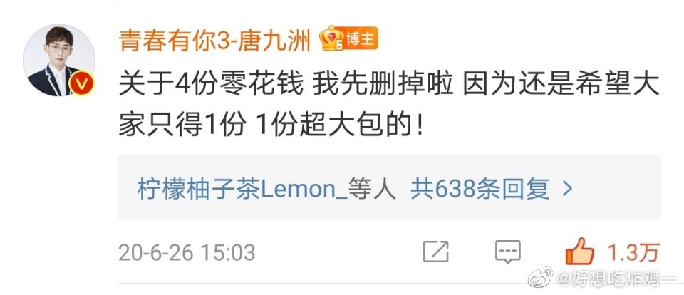 ![]() 当年,名学2辩论赛,辩题“如果有和梦想型的对象闪婚的机会,但一定会离婚,你会接受闪婚吗?”,九洲在正方,一辩还是几辩我忘啦。但九洲的表现挺出色的,在提及到离婚最顾虑的问题是孩子时,他敢于说出自己父母在初中就离婚了,没记错的话,他还选择用“这样你有四份零花钱可以拿呀”来安慰,结果辩论结束后名学播出后他发了条总结,评论里说“关于四份零花钱的事,我先删掉啦,还是希望大家只得一份大礼包!”