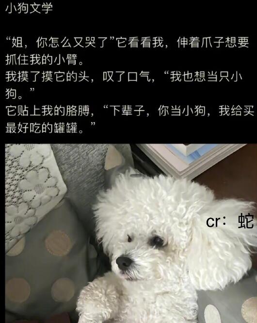 “小狗文学”最早出自博主@我说我是碳水小狗,他经常会以小狗的语气,向大家分享一些有关小狗的哲学,鼓励大家好好享受当下的美好,热爱生活。