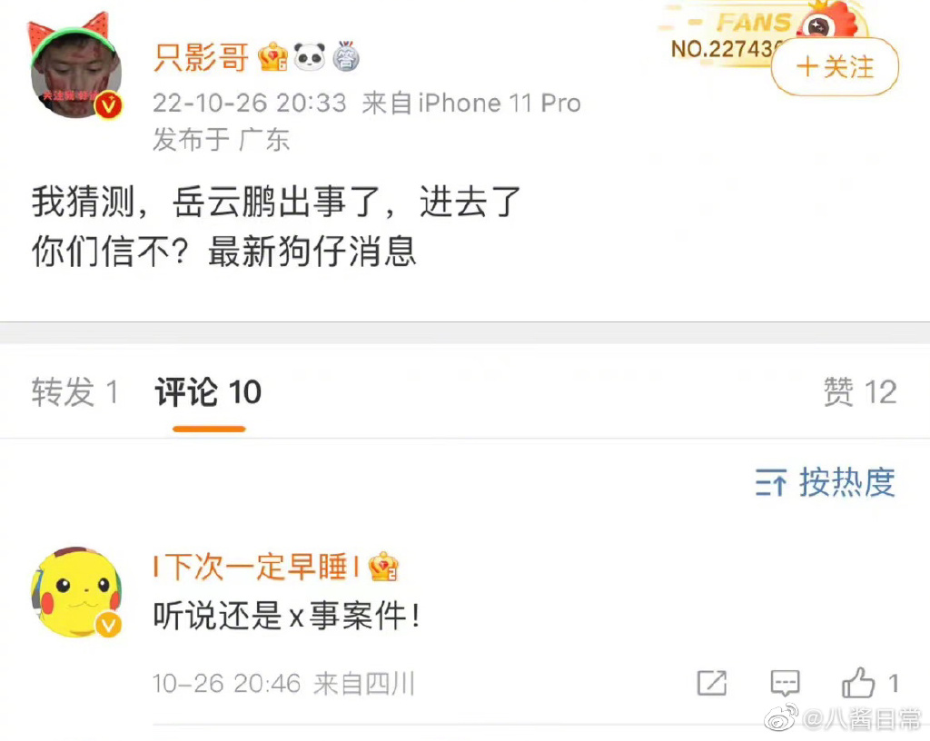 “岳云鹏塌房”的说法有2个第一是,10月26日,某博主爆料说岳云鹏进去了,晚上岳云鹏发照片辟谣,但爆料人依然坚持自己的观点,并让大家拭目以待,不过删除了此前发布的消息。
