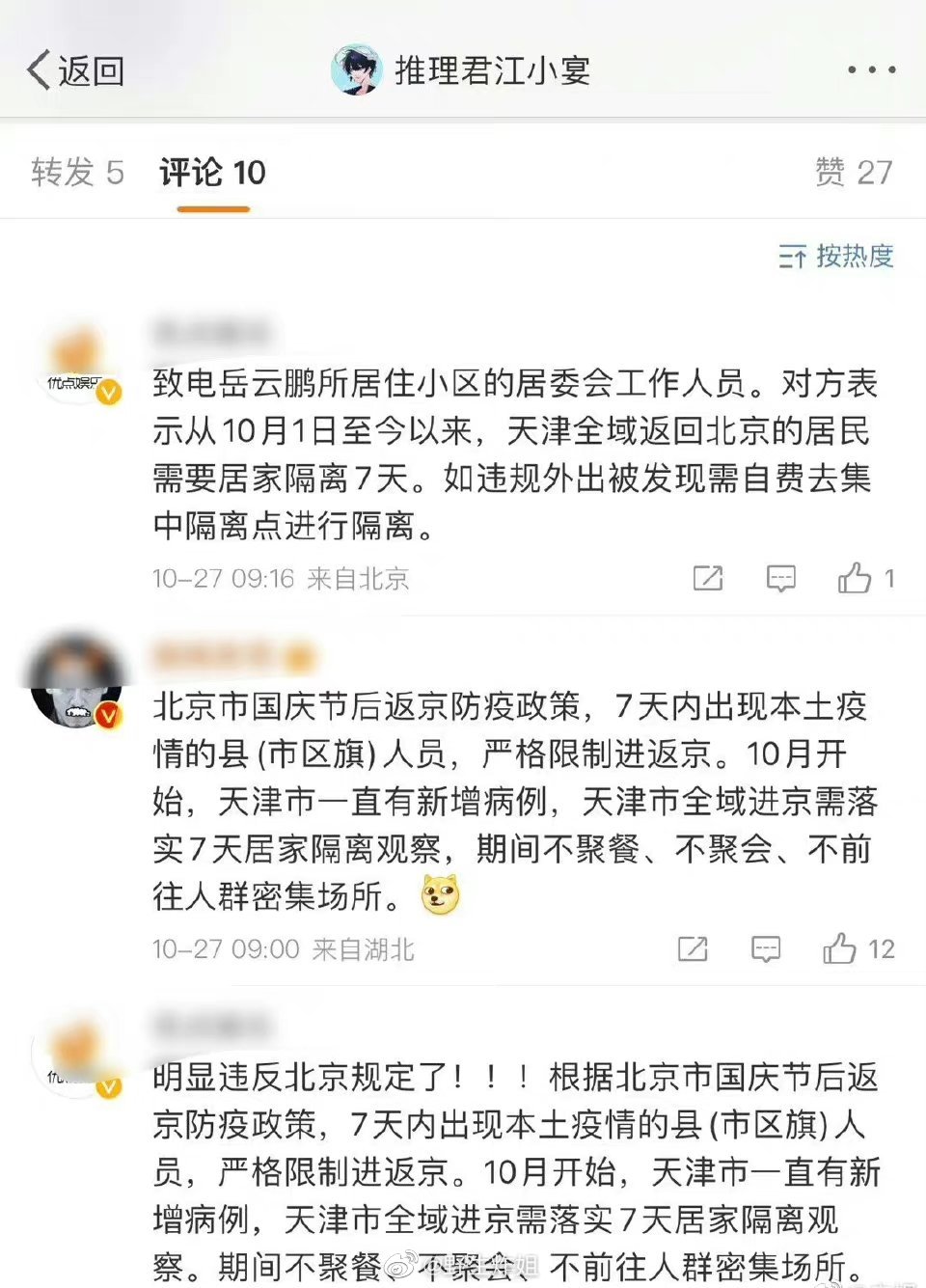 第二则是,27号某自媒体爆料,岳云鹏10月10日在天津拍戏,10月15日现身北京与管虎、王宝强、翟天临等人聚会,根据北京近期防疫政策,7天内出现本土疫情的县(市区旗)人员,严格限制进返京,10月开始,天津市一直有新增病例,天津市全域进京需落实7天居家隔离观察,期间不聚餐、不聚会、不前往人群密集场所!
