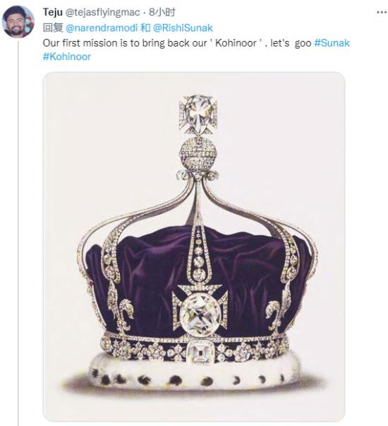 2022年10月25日,据俄媒,随着英国首位印度裔首相里希·苏纳克正式上任,印度网民在呼吁将镶嵌在已故英国女王伊丽莎白二世王冠上的“光之山”钻石归还给印度。据报道,这颗钻石重达105.6克拉,价值5.91亿美元,印度考古调查局认定这颗钻石是在印度中南部的戈尔康达矿采集的。许多印度人认为,这枚钻石是被英国掠夺走的,自从1947年印度获得独立以来,印度方面一直呼吁英国归还这颗钻石。