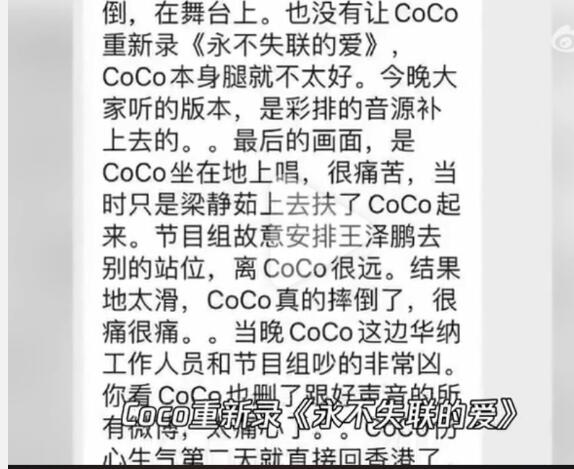 2.李玟决赛时脚伤复发,本来说好和自己的学员王泽鹏挽手唱歌,结果节目组故意让俩人分开,导致coco摔倒,也没有让她重新录《永不失联的爱》