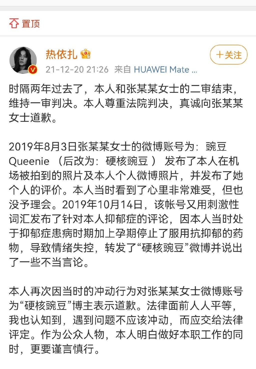 ![]() 其中对热扎依批判的最为尖锐的是一个叫@硬核豌豆(张女士)的网友,她发文称热依扎有“露x癖”还用抑郁症炒作。热依扎随即把网友挂了出来,并放话“我告定你了”。因为热扎依将硬核豌豆给挂出来了,导致热扎依的粉丝对硬核豌豆进行了一轮攻击。而硬核豌豆也不甘示弱将热扎依告上了法庭,最终在2021年份法庭宣判。 法院认为硬核豌豆的发言中有“觉得”这类词,属于个人主观色彩的表述;而热依扎教唆粉丝网络暴力素人的事实成立,法院要求其在判决生效之日起删除相关动态,并向“硬核豌豆”道歉。 ![]() 2021年12月20日,热扎依向硬核豌豆道歉如下: