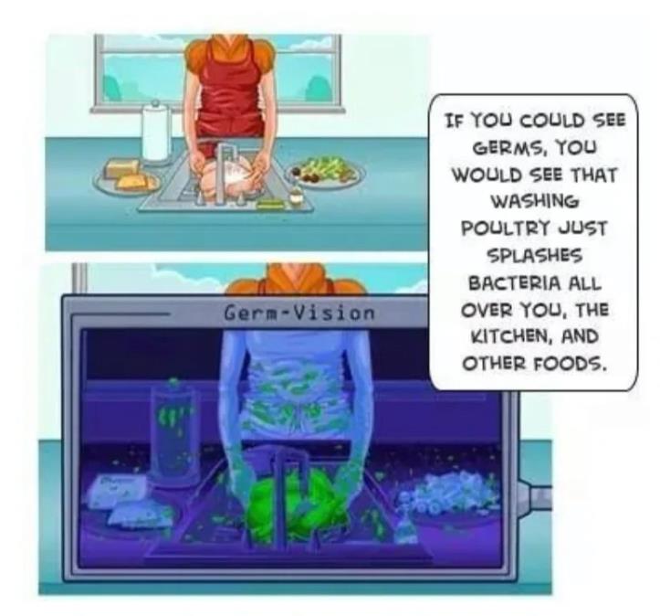 相信很多人买来一只鸡准备做汤的时候,都会冲洗一下,实际上生肉是不能直接用水龙头冲洗的。由于沙门氏菌在鸡肉,禽蛋中的检出率较高,所以在欧美超市中出售的生鸡肉外包装上必须标注Do Not Wash Poultry At Home/切勿在家清洗生家禽肉”。如果你的肉眼可以看见细菌,那么当你在家中厨房清洗生肉时就会看到细菌被飞溅的水滴带到你的全身,整个厨房和其他食物。买回家的生肉才是细菌的主要来源。