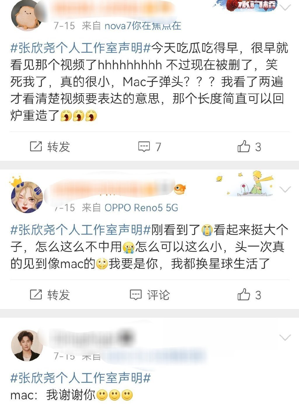 ![]() 下面则是该网友和女朋友的聊天记录,当时该女子和张欣尧在一个房间,该网友让其女朋友开门。 ![]() 据悉,五年前张欣尧发了一则为 《你要不要做我女朋友》的视频瞬间爆火,点赞量直接突破两百多万,一跃成为网红。次年他受邀参加了 《王牌对王牌》,还出了个人单曲,并为古偶网剧演唱主题曲,还曾上过部分卫视的春晚。但让张欣尧真正走进大众视线的,是参加了成长综艺《创造营2021》,以第20名的成绩进入总決赛,最后并未组团出道。 其实除了张欣尧这次塌房之外,在此前还有一个MAC塌房的梗,就是上厕所露自个儿“不可描述部位”的视频,但是只有Mac大小...下面当时的讨论。 ![]() |