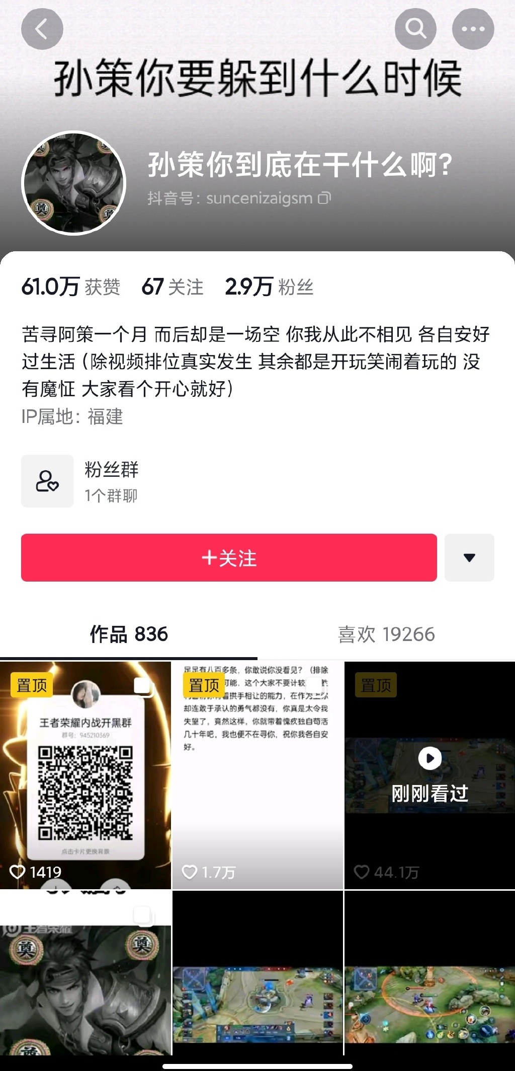 “孙策,你到底在干什么?”的梗源于一名《王者》玩家他在八月底输了一场排位赛,关键时刻队友孙策死活不点塔还原地开秀,导致最后被对面反推水晶,一气之下,他连夜上传视频全网通缉这名孙策,并在接下来一个月内持续输出。虽然到了十月份,他发文称要原谅孙策,但是后面越想越气劲,再次发起冲击,截至目前为止,一共发起了近900条视频。甚至改“@孙策你到底在干什么啊?”