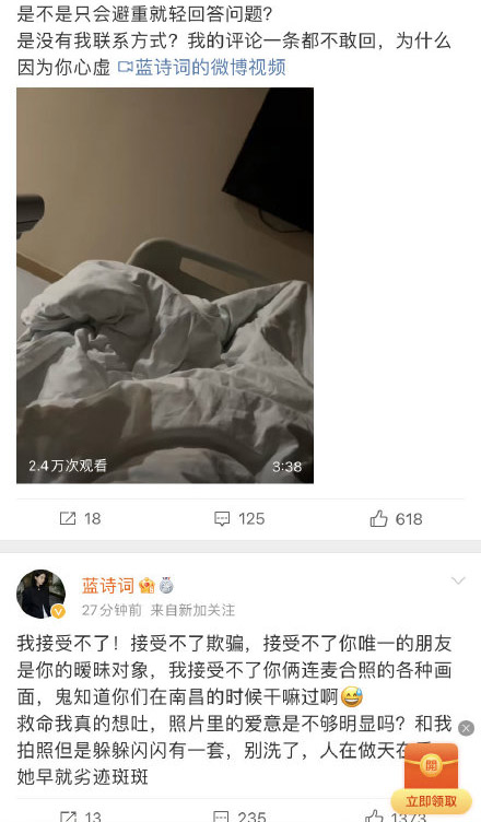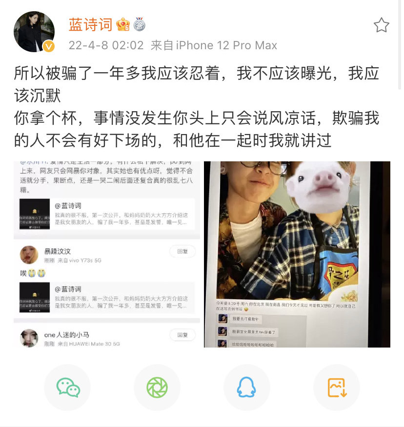 想了一下觉得有些事情还是需要解释一下,首先隐瞒了蓝确实是我的问题这点无可厚非是我的问题,但是我的出发点不是有意欺骗,可能是怕她生气也可能是我自己心虚的原因,我以前确实很坏很花心,我害怕自己在意的人知道或者听到自己不好的地方就会不喜欢了会离开自己,所以会下意识的去隐瞒一下东西,觉得过去了的事情是可以不提的,但今天才意识到这件事会给蓝带来这么大的伤害,真的对不起,我也不想去解释太多,我对这份感情多认真多在意我心里是最清楚的,唯一一点想澄清的是在我和蓝在一起的时间里,没有跟任何一个女生聊过一次骚也没有跟任何人暖味过,这点我可以很确定的告诉你们,其实两个人在一起开心的时候是真的很开心当下的感受也是真的可以愿意为对方付出一切,看到蓝说的这些话除了难过也不知道该去说什么了,好像所有的缺点一夜之间都出现了,这件事的起因是我隐瞒导致的,造成的伤害也是我不想看到的,没有告诉蓝蓝是因为那都是20年的事了真的很久很久没有联系过了,就只是当个普通朋友的忙,没想到会给她带来这么大的伤害真的对不起。