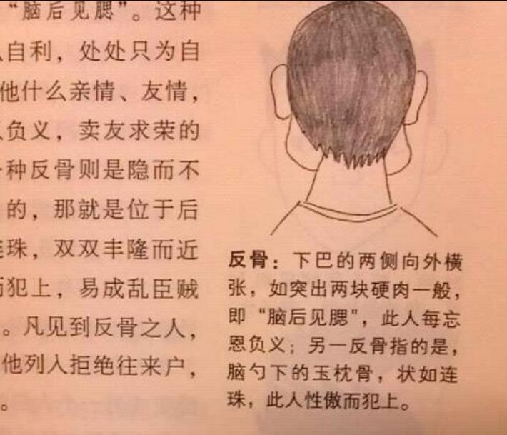 网上有很多文章,甚至所谓的专家言之凿凿的说,“反骨”是后脑的枕骨,说那些枕骨凸出,有着圆脑壳的就是有“反骨”,这是不对的。