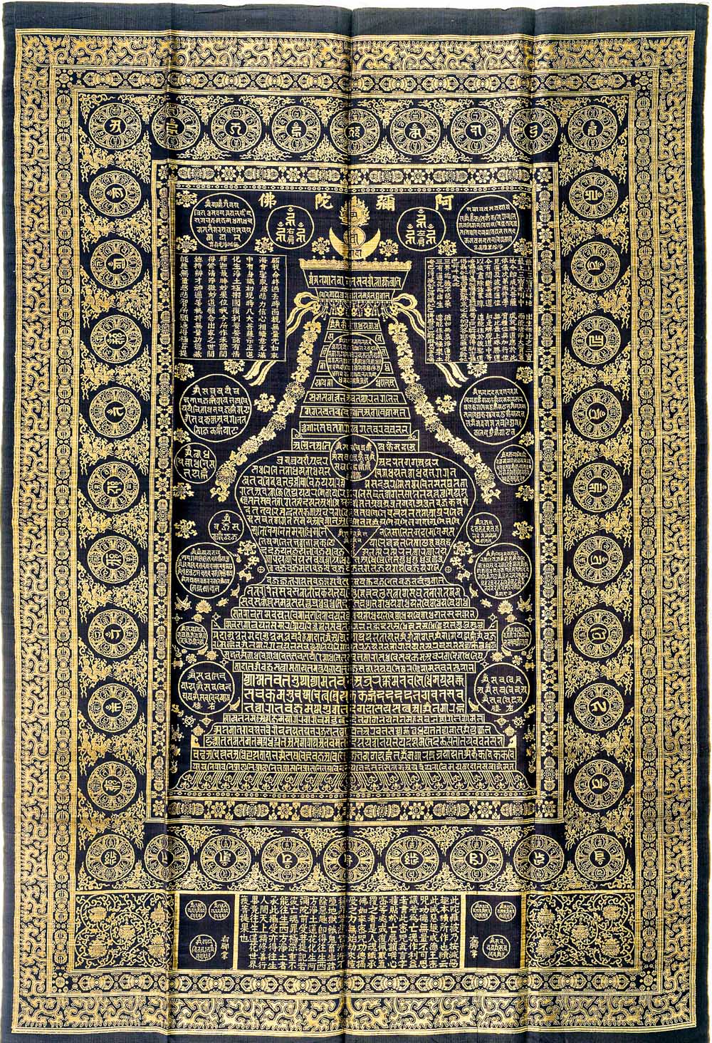 ![]() 陀罗尼经被活人是不可以用的,是织有金梵字经文的随葬物,给死人用的。“陀罗经被” 又名“陀罗尼被”、“陀罗被”、“陀罗尼衾”,因常用在往生者或往生动物身上,又称“往生被”,上面有多种由梵文或藏文、中文书写的诸佛菩萨真言密咒及诸佛菩萨、金刚力士的功德名号。