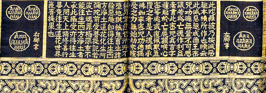 一般来说,陀罗尼经被上会标记人身体的部位(如下图“右脚掌”、“左脚掌”),根据这些位置覆盖到亡人的身上即可。 ![]() 上图我们也可以看到陀罗尼经被上的经文内容:“此陀罗被乃按灭恶趣本续所作也,续云:此灭恶趣威德王密咒,功德无量,不可思议。若为亡魂作利益者,书此密咒真言字种,贴于亡尸额、喉、心、密等处,或复佩戴、盖覆之。是人魂识承佛如来密咒功德摄受之力,无始劫来种种罪业,悉皆清净。不堕地狱、饿鬼、畜生诸余恶趣,即得往生西方净土,莲花化生阿弥陀前,受菩提记。若彼亡魂极深重,不能往生西方净土者,承此摄受,亦得往生人间天上,精修善行,毕竟往生莲花世界,获菩提果也。” 既然叫“陀罗尼经被”,这经文应该是属于陀罗尼经。 ![]() 需要注意的是,陀罗尼经被是不可以火化的,如果非要火化可以咨询高僧具体方法,使用方法如下: