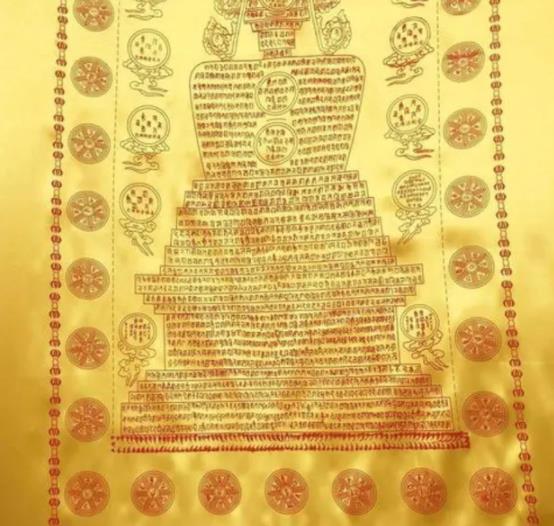 2、盖的方向不能错。在陀罗经被上标有人体部位的汉字:“左肩”、“右肩”、“脐间”、“密处”、“左膝”、“右膝”、“左脚掌”、“右脚掌”。这只是一个大体的部位而并非按人体的高矮制作。