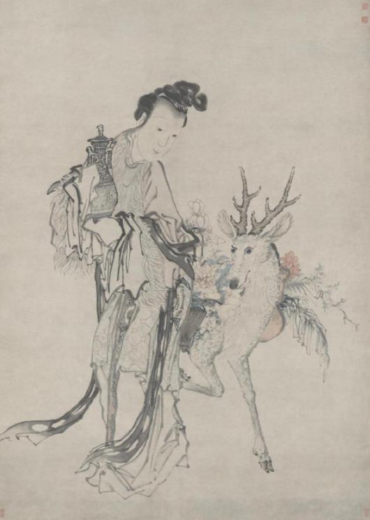 “麻姑献寿”实际跟“八仙过海”一样,都是民间的神话故事。从古至今,人们塑造了很多寿神的形象,麻姑女仙就是其中的代表。那么作为“寿神”,麻姑是给谁献寿呢?传说故事是给西王母娘娘,在湖南博物院就有一副黄慎画的《麻姑献寿图》,这幅《麻姑献寿图》中,黄慎在继承并创新了传统线描手法的基础上,以书法入画,用草书手法表现麻姑衣物轻盈、飘逸的质感,画面简洁,绘画功力娴熟。画中麻姑手捧酒壶,象征着为西王母祝酒献寿,旁边有仙鹿陪伴,也寓意着吉祥、长生。