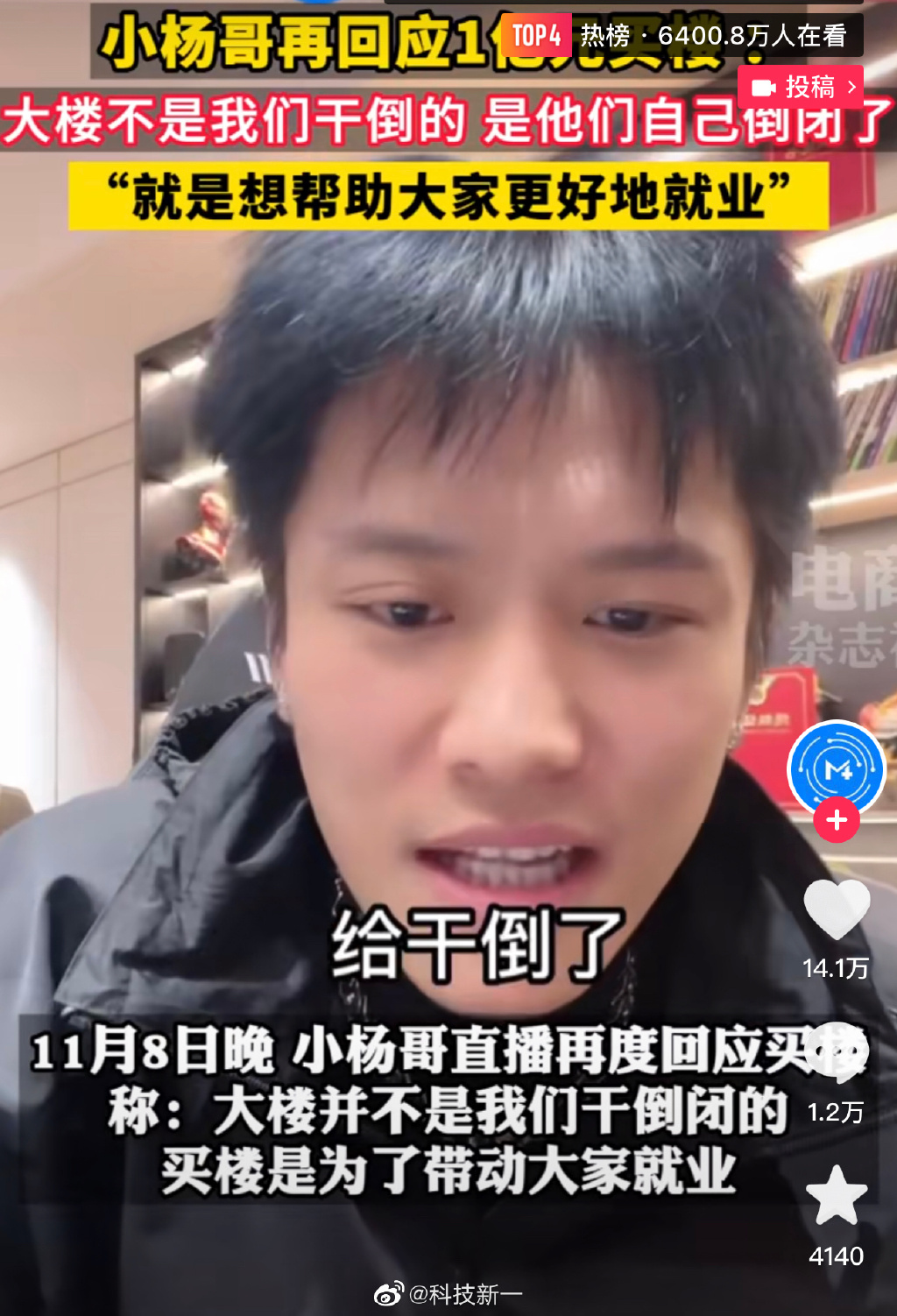 近日,网红疯狂小杨哥斥1.03亿买楼的新闻,引发网友关注。11月8日晚,小杨哥直播再度回应买楼称“那个科技公司早在17年就倒闭了,只是我们现在买了下来。买楼是为了把公司做得更大,帮助大家更好地就业。”对于一个科技公司被娱乐公司收购,很多网友愤愤不平,感觉很可耻,也有人觉得小杨哥自己赚的钱想干嘛干嘛无可厚非。其实说实话这种顶级网红还真不是大家想得那么简单,谁都能干的,需要有极好的天赋,加无比的勤奋。你要是真觉得网红来钱容易,那你自己怎么不干呢?所以说还是有门槛的,任何一个行业做到金子塔尖都很赚钱,但这种人寥寥无几,全网不就才出了一个小杨哥是吧?
