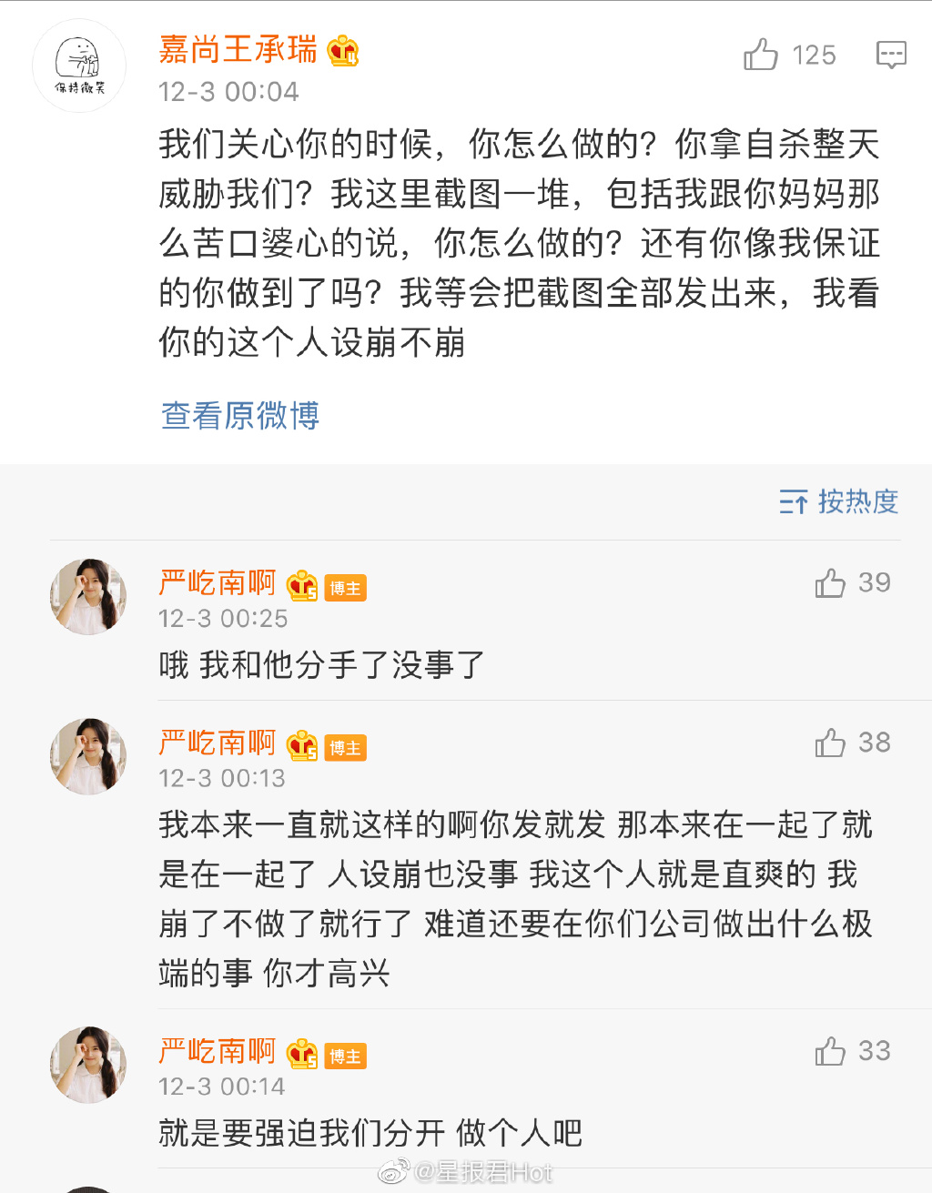 严屹南发微博表示:“js老板真的触碰到我底线了,我不知道你知不知道我生着病,上次你的一句快死吧已经让我很难受了,哦,我就是跟chy在一起好久了。今天跟我妈说强迫我和chy分开(说是为我们好,我能理解)就因为你们公司另一个艺人出事了并且本来就是真的,现在就突然这样吗?自己管不好公司里的艺人谈恋爱,谈了就谈了都那么实锤了还不承认我真的不懂.有什么意思.非要我在你们公司做出什么极端的事吗?哦我单方面说分手不影响公司了。” ![]() 对于严屹南的爆料,王承瑞很快做出回应称:“帮我跟小南(严屹南)说下哦,我们上次谈完我就已经说了,我不阻止你们恋爱,尽管我是不同意的,但是我还是接受了,但是要求是不允许在网上乱发微博和朋友圈了,她也答应了,大家都已经妥协了,为什么还要这样反反复复,我顶着公司的压力,做最大的退步,本身我就已经很不容易了,现在还这样,难道我不累的吗?底下人怎么看我?什么都没招惹,发一堆说公司让她生病了,我是真的不明白要怎么样才可以停止,今天起,我不管这些了,她要怎么样就怎么样吧,真的说实话,我在为你们考虑,你们一点都不为我考虑,我不会在干涉你们任何事情,公司不做任何回应,也希望她不要在做伤害自己的事情了。” ![]() |