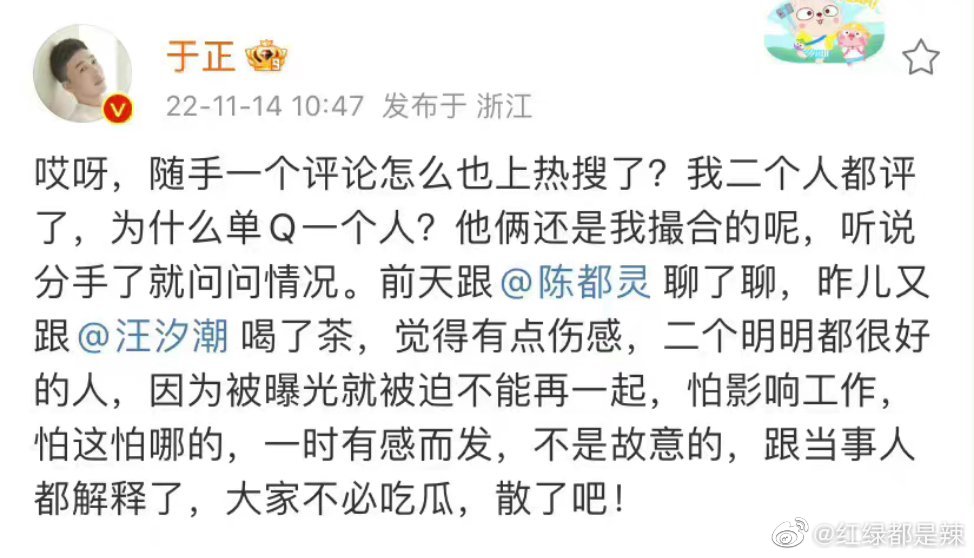 2022年11月11日晚,陈都灵晒视频称“回家过光棍节”,13日,于正 评论汪汐潮 :“情场失意,事业就会好,加油啊!见光死的爱情不牢靠,不要也罢! ” 心疼陈都灵! 陈都灵和汪汐潮是经过于正撮合认识并在一起的,这一点于正也说了,他说:“他俩还是我撮合的呢,听说分手了就问问情况。前天跟陈都灵聊了聊,昨儿又跟汪汐潮喝了茶,觉得有点伤感,二个明明都很好的人,因为被曝光就被迫不能再一起,怕影响工作,怕这怕哪的,一时有感而发,不是故意的,跟当事人都解释了,大家不必吃瓜,散了吧!”