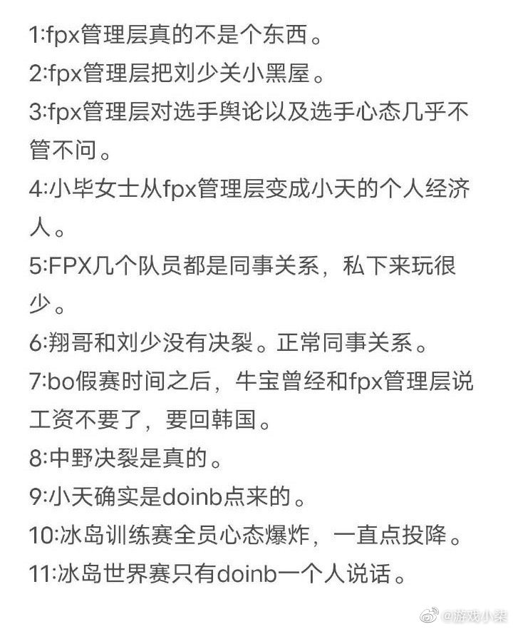 2.冰岛那会儿fpx训练赛打dk和t1就没赢过导致队内气氛冰冷,就只有一个人在活跃气氛。fpx管理层不作为,且是后勤人员带的最少的队伍。