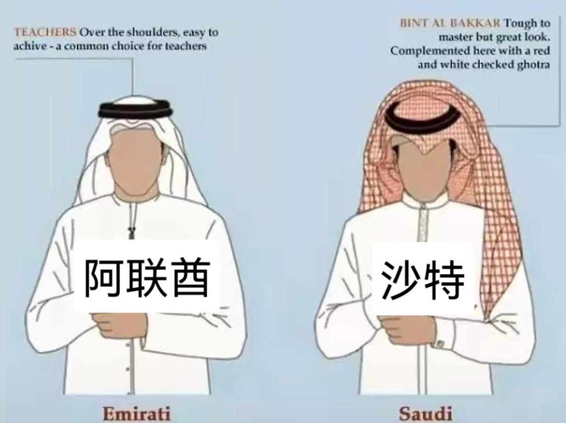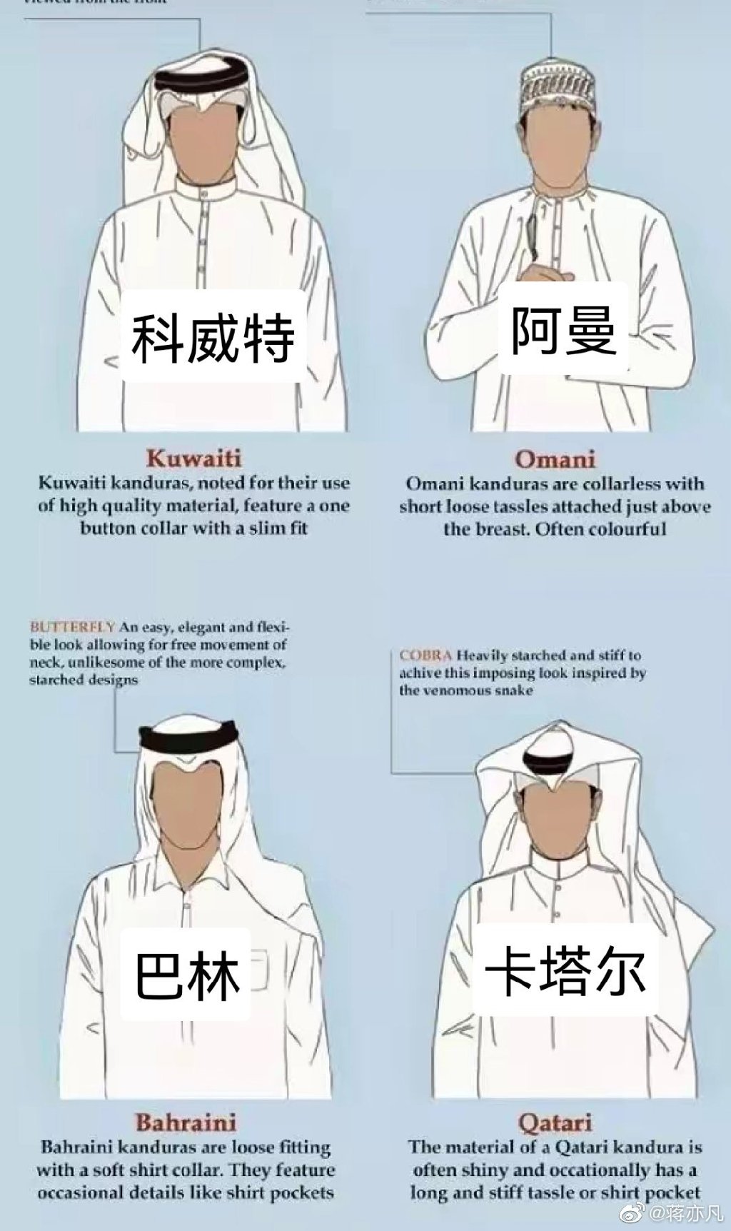 这种头巾并没有颜色等级之分,但是可以很好的区分不同阿拉伯国家和地区的人,比如比如阿曼、沙特红白相间的比较多,阿联酋、科威特、卡塔尔多为纯白色,巴勒斯坦等地黑白相间的比较多,埃及等国更多的是白布缠头,部分有名望的谢赫还会在缠头之前戴上一顶红色菲斯帽。 ![]() 值得一提的是,原来海湾地区各国的头巾样式还有细微区别。给大家看看阿联酋、沙特、科威特、阿曼、巴林、卡塔尔头巾方面的细微差别: ![]() ![]() 最后给大家分享7个卡塔尔世界杯的有趣冷知识;