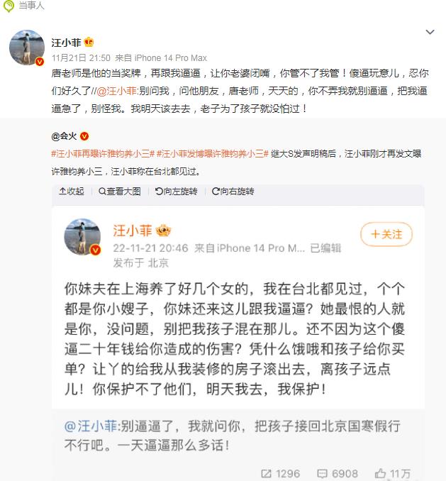 最近汪小菲和大S家族“你来我往”的互怼大战好不热闹,目前来看汪小菲的爆料并没有什么杀伤力,比如爆料大S吃的某种药实际是安眠药、然后又爆料小S老公养小三,其实小S老公许雅钧是花花公子是有目共睹的,大家都知道,现在再爆料这个也没有什么杀伤力。在爆料许雅钧养小三的时候,还曝出了一个神秘人物“唐老师”,汪小菲表示:“别问我,问他朋友,唐老师,天天的,你不弄我就别逼逼,把我逼逼急了,别怪我。我明天该去去,老子为了孩子就没怕过!”