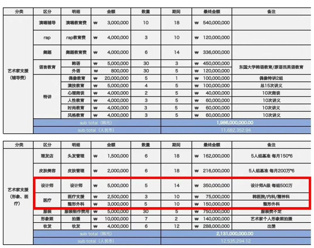 蔡徐坤前东家依海文化晒出为蔡徐坤等练习生(注意里面有个“等”,这里可不是指的蔡徐坤一个人)签订的培训合同以及部分训练和整形费用明细,根据明细列表的整理来看整形的费用比重并不是很高,而妆发的费用竟然超过了整形的费用,两者对比为妆发费162000000韩元(根据今天此时的汇率进行兑换金额为853254元),整形费为150000000韩元(根据今天此时的汇率进行兑换金额为790050元),两项费用差距在约6万元左右。