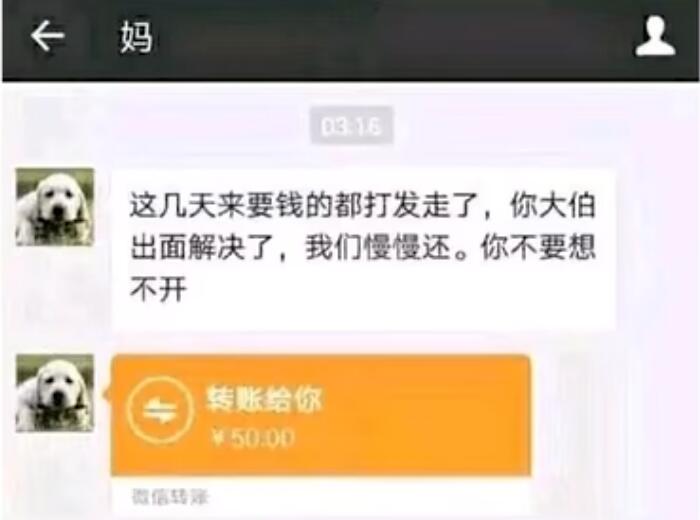 出自百度贴吧戒赌吧的一张图,一位沉迷DU博多年的老哥,因为DU博欠下十几万的赌债,于是外出躲债,留下年迈的母亲一个人在老家应对债主。而妈传菜的对话就是在这样的背景下发生的