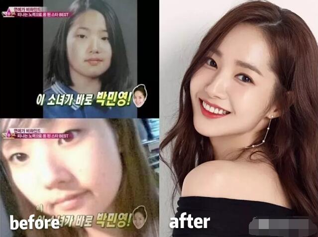 论整容最成功的艺人,必须是朴敏英。出道前朴敏英兼具了韩国人面部传统特征:大圆脸、单眼皮还有塌鼻子。现今出道11年后的她,早已看不到当年的影子,完全从丑小鸭蜕变成了白天鹅。在中学时做过双眼皮手术后,朴敏英又做了开眼角和隆鼻手术,这时候的她便有了美女雏形。不过,在后面应该又“返工”了,因为卧蚕眼更明显了,眼睛更圆更萌了,鼻部的假体相比前几年更自然了。看完朴敏英的变脸历史,感叹当今整形技术高超!正确的审美观也很重要,唯有如此才会美得自然。
