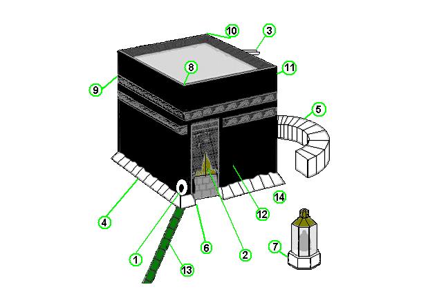 ![]() 克尔白里面对着门的地方是先知祈祷的地方;在穆斯林的心目中,天房就是真主的象征,他们做礼拜的朝向就是克尔白的方向。天房的里面是控的,但是内部的结构如下图所示: ![]() 克尔白外部的每个部分的解读: ![]()