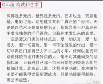 作为跑男团队长的邓超即便没有参演电影,但他还是发了一场名为“鸡贼与艺术”的微博回怼冯小刚。至此,二人矛盾再度升起。更巧的是。10个月后,邓超执导的《恶棍天使》和冯小刚的《老炮儿》撞档。邓超凭借综艺积攒的人气以及夫妻党的吸引力,票房曾一度猛超《老炮儿》。冯小刚心里着急,但也没什么办法,只能对着话筒暗戳邓超不遵守行业道德,一天没事就搞什么点映,甚至在刷微博时还不小心点赞了吐槽《恶棍天使》的黑文,由此可见他内心的不服气。不过,这场没有硝烟的战争很快就被盗号和手滑敷衍的过去。
