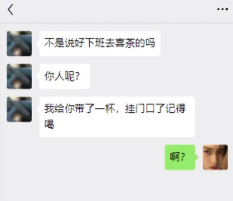 今年八月份,这句话出现在一段微信聊天中,女主在周末晚上对闺蜜室友吐槽“周一去喜吧”,结果闺蜜回了一句“好”。到了第二天晚上,回家后发现自己合租的房门上挂着一杯喜茶,打开微信一看,闺蜜留言,不是说好下班去喜茶的吗?你人呢?原来闺蜜昨晚那句“好”是这个意思,理解成了“周一去喜茶吧”,因为没等到女主,就买了一杯送回来,自己回去加班了。