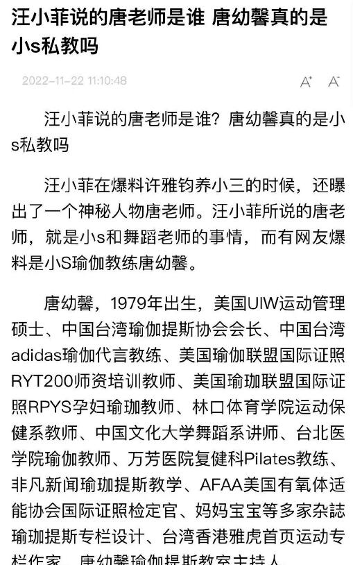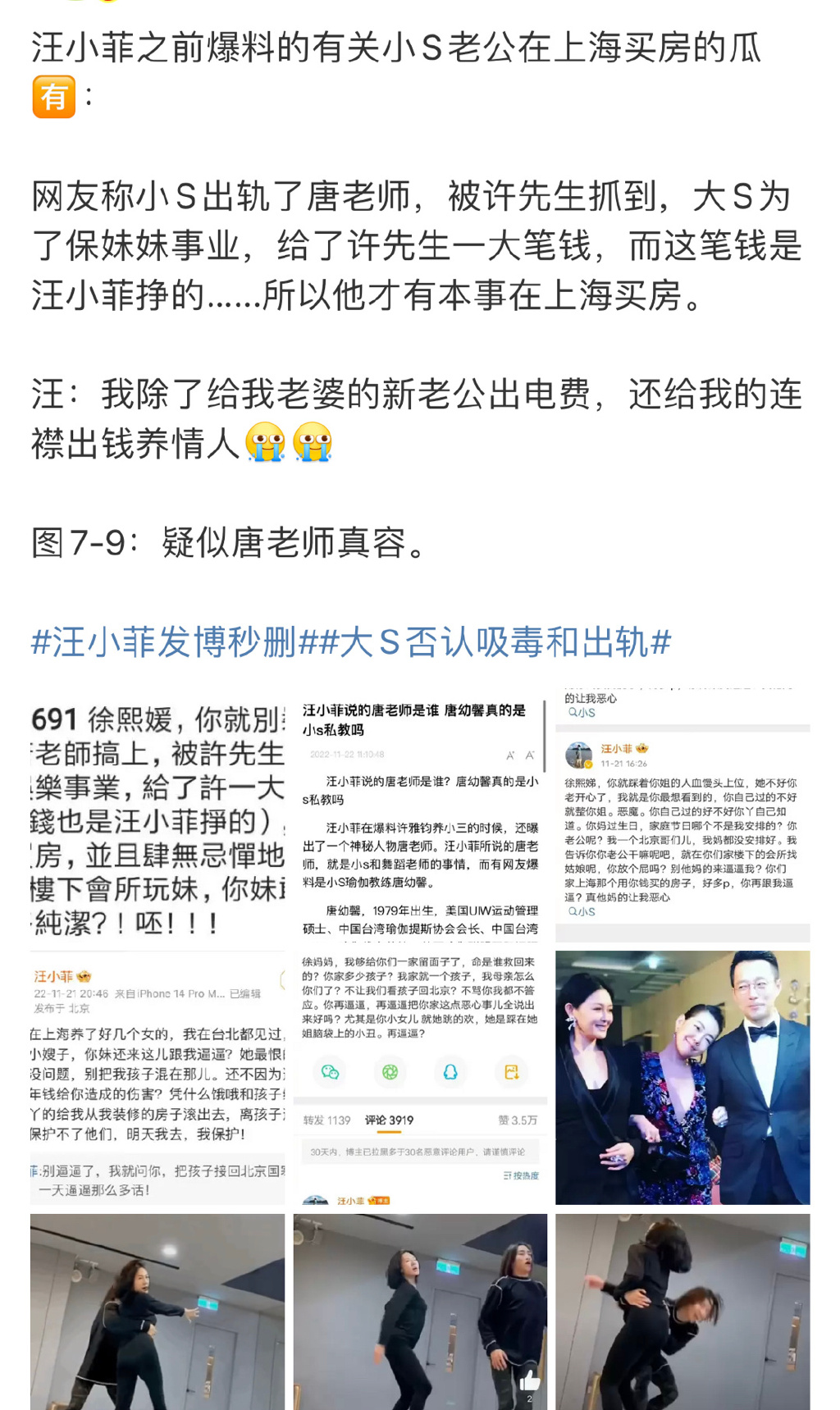 5,小S之所以不敢说话,疑是因为小S出轨唐先生被许当场捉到,许雅钧拿着汪小菲付给大s的一大笔赡养费在上海买了房;