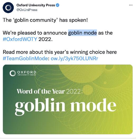 “哥布林模式”英文为goblin mode,其中,goblin为“地精”,是一种源自欧洲民间传说中的小怪物,他们身材矮小,个性贪婪又卑劣,性格倾向邪恶、狡猾、善于诈欺,爱找麻烦,很难对付。mode则为“模式”的意思。