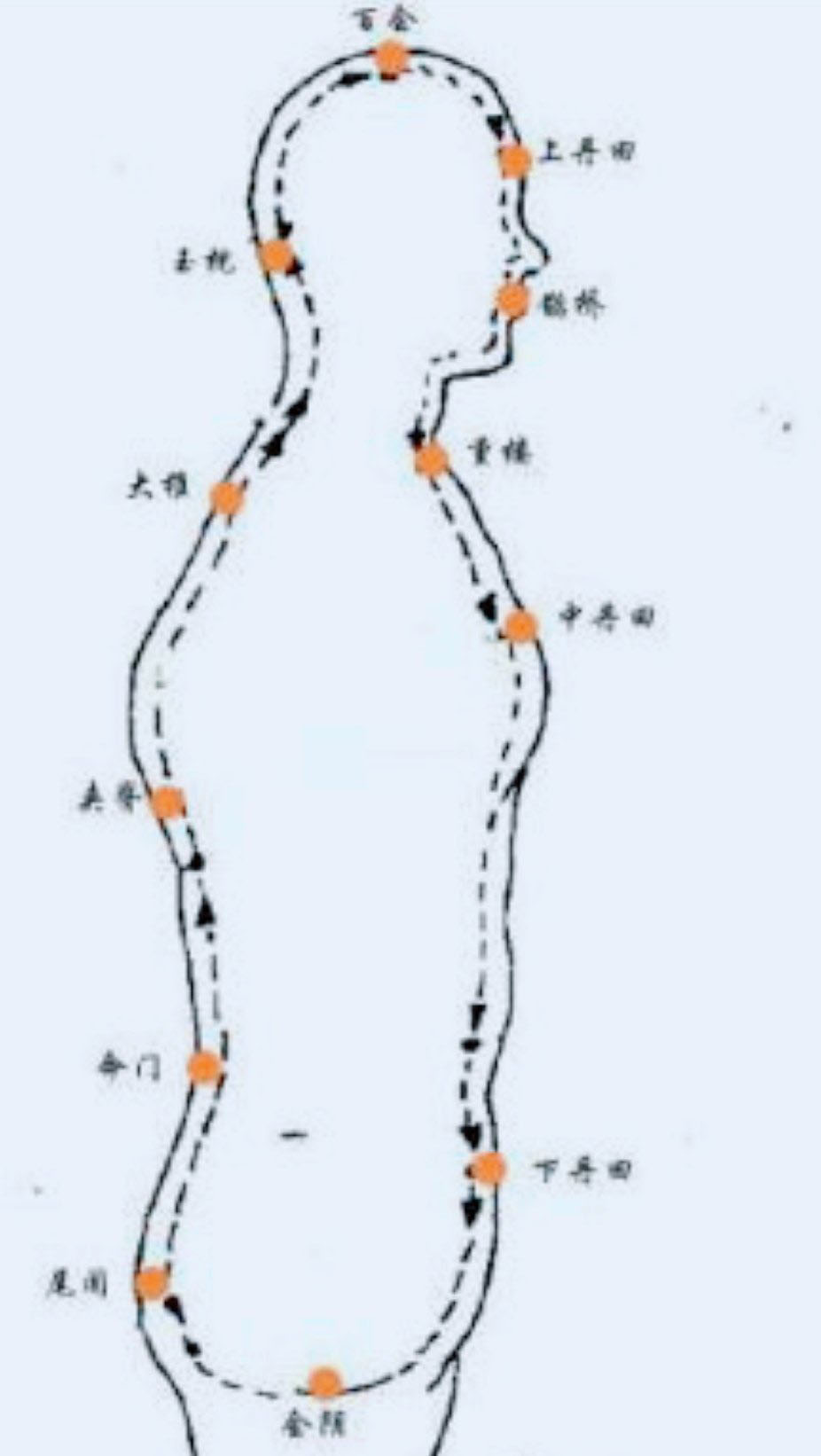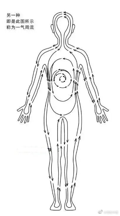每个人的身体内的经络有两套系统:一个是小周天,一个是大周天。这里所谓的“周天”指意念导引精气沿经络循环绕行,称之为“周天”功法。小周天功法指意念导引精气打通任督二脉,称为“小周天”;如是打通身内的十二条经络的循环,则称之为“大周天”。一般来说,大周天的十二条经络其实只是三条长长的经络的循环,都是从小腹内的丹田出发,上行至胸,由胸再行走到手臂内侧→手→手臂外侧→头→躯干→下肢外侧→脚→下肢内侧→再进入小腹。
