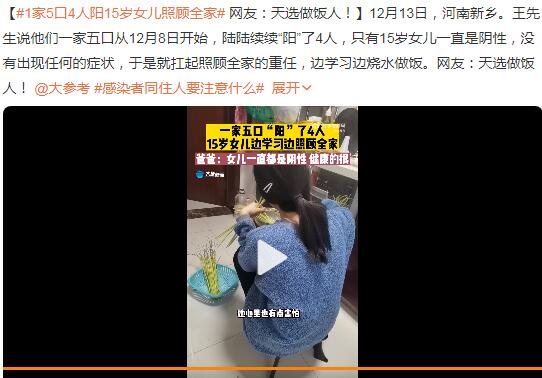 出自新闻“1家5口4人阳15岁女儿照顾全家”河南一户人家,一家五口都羊了,发高烧,只有15的女儿没有任何症状,于是女儿就扛起了照顾家人的重任,一边学习,一边做饭。