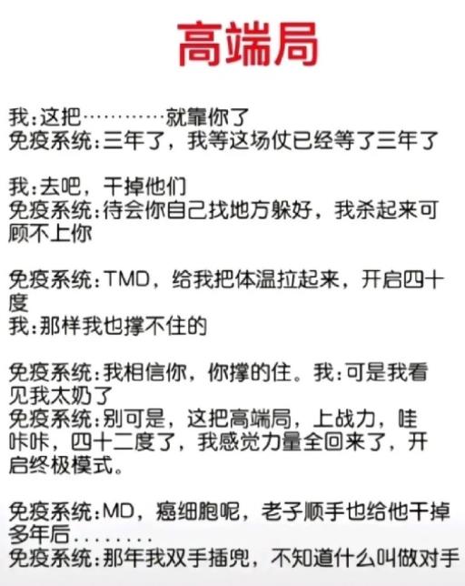 但有的人会想,这不是乱搞吗?免疫系统这样做,不是杀敌一千自损八百吗?确实是这么回事,网友还给免疫系统和人体写了一个段子,希望大家开心一笑,心情好,免疫力也会好!