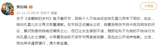 目前,费启鸣已经发文向孔雪儿 道歉,称绝无嘲笑之心,“关于《宝藏般的乡村》鱼子酱环节,因我个人不恰当反应给孔雪儿带来了困扰,在此,我向孔雪儿女士再次郑重道歉。在节目正式播出之初,我看到相关节目片段及网友的评论,意识到虽然我绝无嘲笑之心,但已让女生感到不适,随即在私下为我的不恰当行为向孔雪儿女士道歉。今早看到当初不妥环节再度被发酵,现在此公开说声抱歉。之后,我也将会谨言慎行,请大家监督。”