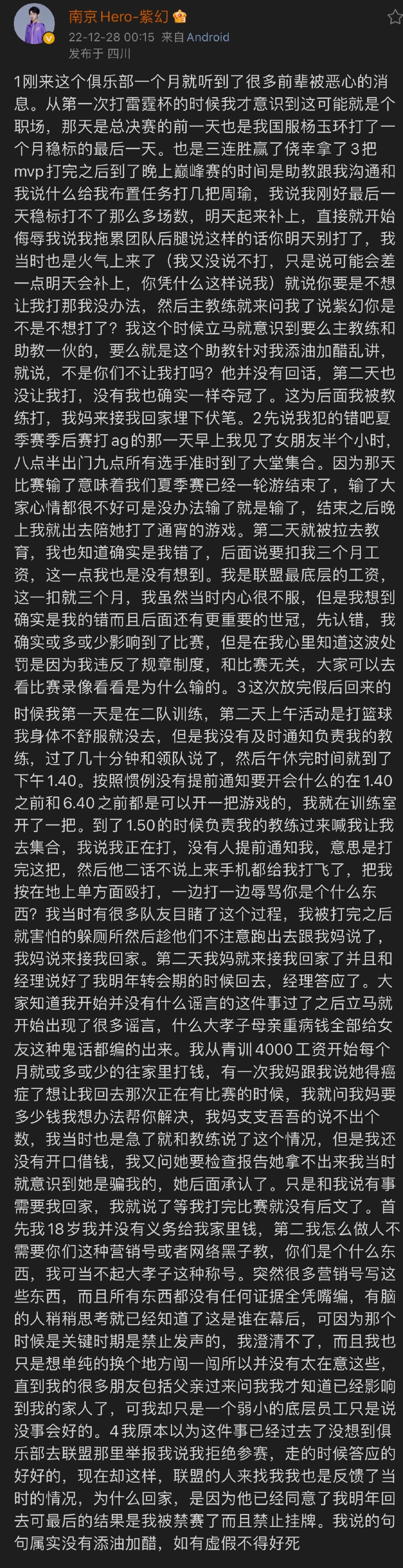 2022年12月28日凌晨,南京Hero紫幻在微博上发出长文控诉俱乐部,总结起来大约一下几点: