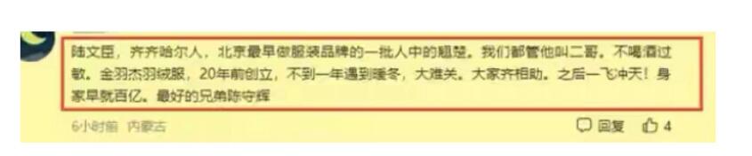 还有网友扒出男方是20年前第一批在北京做服装品牌生意的,早就实现了财务自由,旗下还有羽绒服品牌,以及多家公司,身价可能超过百亿。