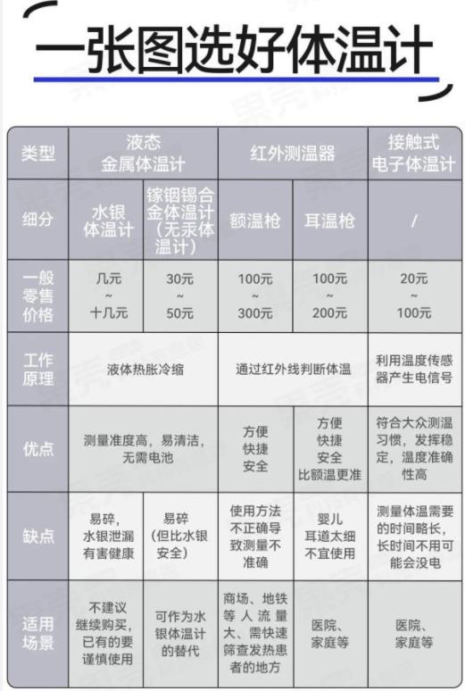 ①水银最便宜,量体温最准,缺点是耗时长,要十分钟。