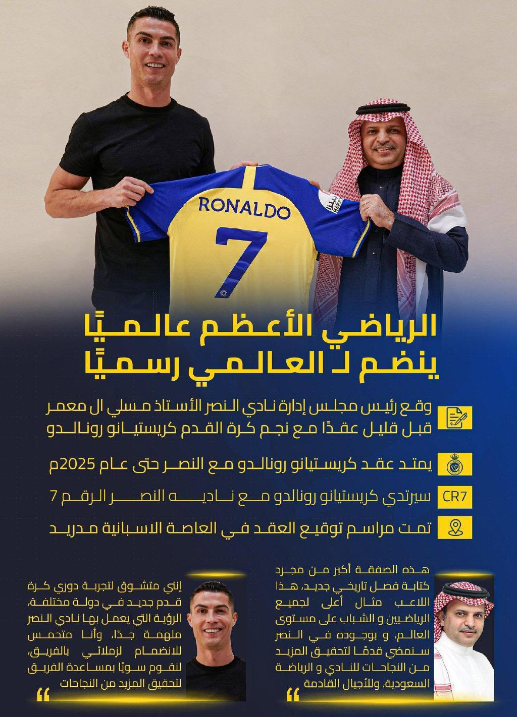 根据官方公告,C罗与利雅得胜利签下了一份到2025年的合同。此前有消息称,C罗年薪接近2亿欧。