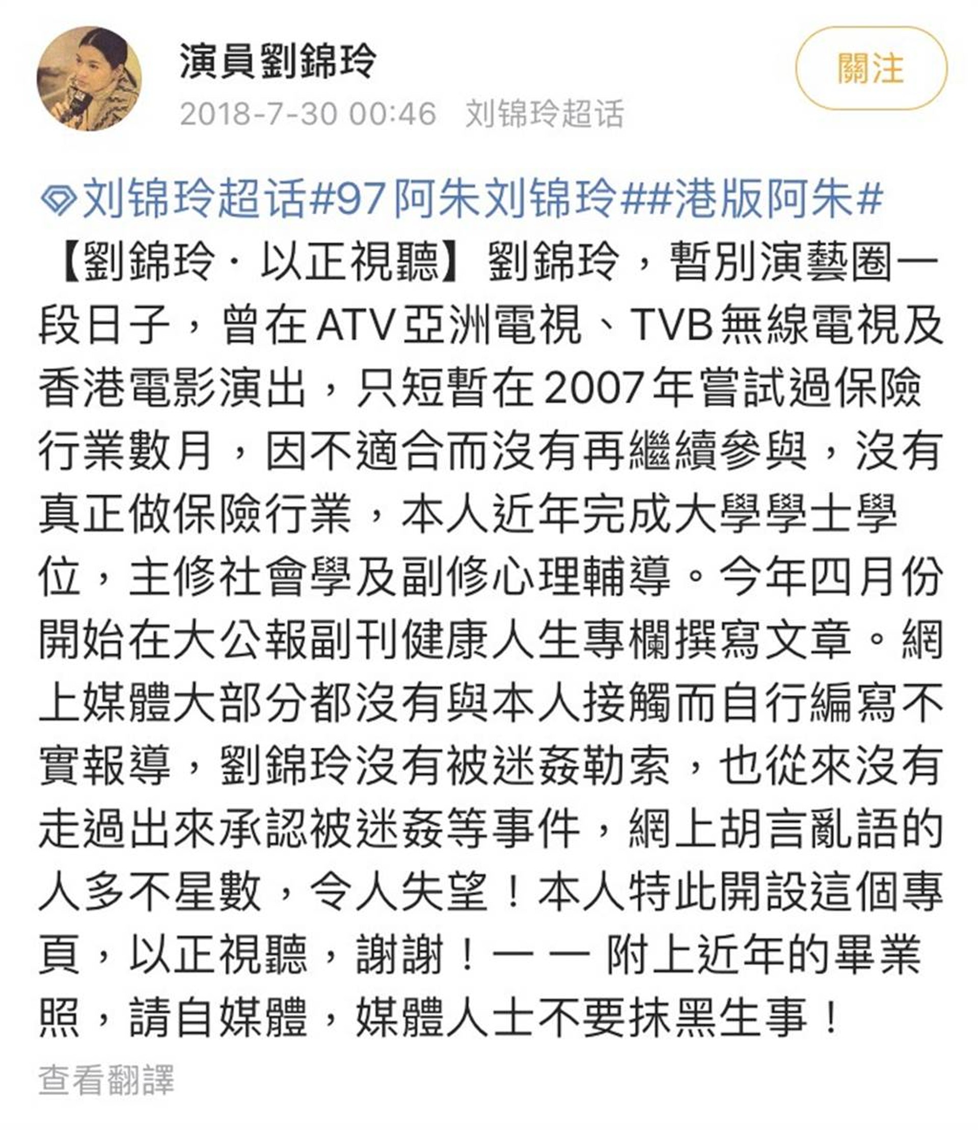![]() 那么,刘锦玲为什么不拍戏了呢??这个问题刘锦玲也亲自回应过: 刘锦玲曾于2019年在微博发长文表示:「对于那么多的不实传闻,少有人求证便传得沸沸扬扬,令人感慨……因我对当时某些阻碍不满及不愿和亚视续约,被某些人刻意制造一连串负面新闻抹黑我,说我不饮水思源云云,什么态度不合作,耍大牌一大堆『罪状』……其实,所谓『雪藏』,据了解是因为没跟随圈中的所谓潜规则,没送礼(没钱送啊),也没有后台撑腰的缘故。92年开始,有外界邀请我合作时,常受公司掣肘,推辞不少工作,还差点错失出外拍电影《天长地久》(1993年放映)的好机会。」揭露了圈中的黑暗面。 也就是说因为不满圈内的潜规则,以及不服从圈内的潜规则,所以刘锦玲慢慢的淡出了娱乐圈,不演戏了。 至于刘锦玲说的抹黑她的负面新闻指的是2002年媒体曝出的:“刘姓女艺人被人迷奸勒索事件”,当时有两个说法,一个是刘嘉玲,一个是刘锦玲,实际当事人并不是刘锦玲,也不是刘嘉玲,另有其人;网络上还说2006年刘锦玲拍完《法证先锋》后投身保险界,当时又有报道指她收入极低,生活惨淡。直至后来在2018年刘锦玲在社交平台多次公开澄清指报道失实,解释自己生活很好,并在接受访问时透露自己淡出幕前后重返校园,在2015年取得美国三藩市州立大学学士学位(主修社会学、副修心理辅导),期间还曾担任心理辅导员。她现时定居美国和从事教育工作,担任《大公报》、《明报周刊》「星阵」专栏作家,更攻读硕士课程,希望日后可以考牌做辅导员。 ![]() |